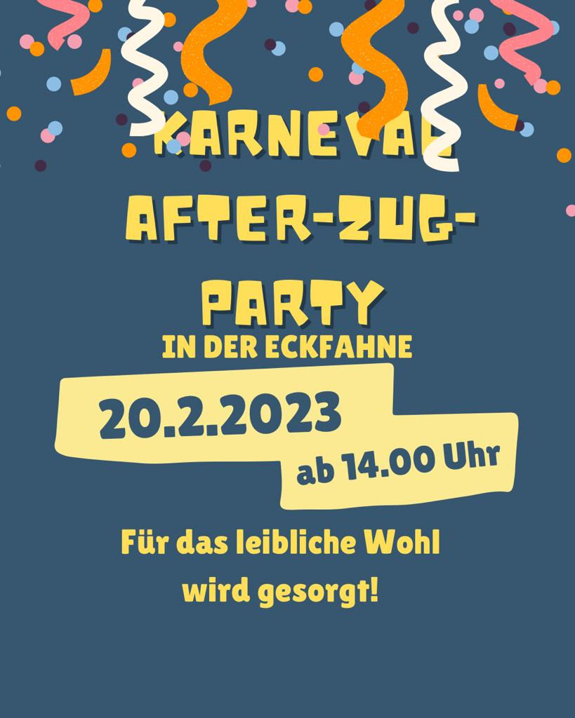 AFTER-ZUG-PARTY an Rosenmontag15. Feb. 20231 Min. Lesezeit𝗛𝗲𝗹𝗮𝘂 𝘂𝗻𝗱 𝗔𝗹𝗮𝗮𝗳 𝗶𝗻 𝗱𝗲𝗿 𝗘𝗰𝗸𝗳𝗮𝗵𝗻𝗲 - zur "𝗔𝗳𝘁𝗲𝗿-𝗭𝘂𝗴-𝗣𝗮𝗿𝘁𝘆" am Rosenmontag ab 14.00 Uhr sind alle herzlich eingeladen! Für das leibliche Wohl der großen und kleinen Gäste ist gesorgt!